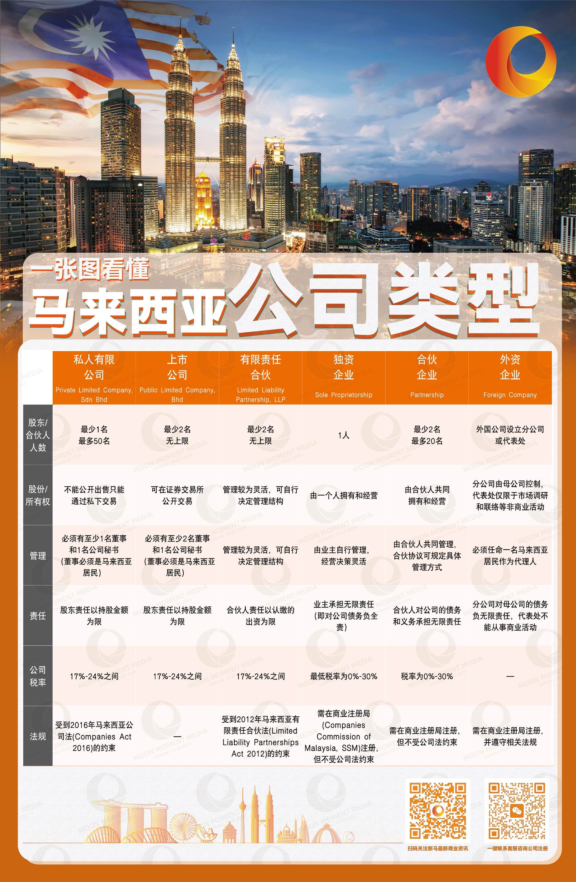 一张图看懂马来西亚公司注册类型在全球化商业环境中,马来西亚凭借战略位置优越、文化多元以及经济政策开放等优势,备受国际企业和投资者关注。对于有意在该国开展业务的公司和个人来说,了解当地公司体系和注册流程极为重要。